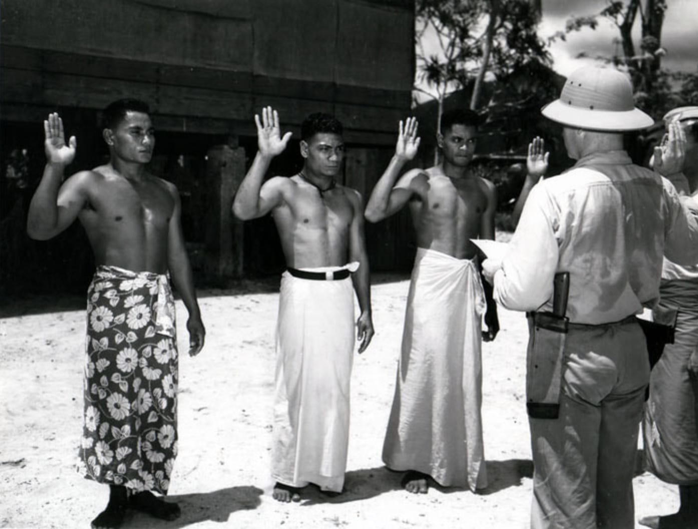 In Āpia, Malifa and Leififi school compounds became barracks and storage sites for ammunition and officers’ accommodation. The main fenced and guarded camp was three kilometres south of the harbour at Magia, which was labelled 'Taulaga Meleke' (American town) by Sāmoans. As the Marines moved beyond Āpia, they evoked memories of harsher times during the Mau period. In Solosolo, Faasalafa Leota recalled the first time the marines arrived. The pastor’s wife put on the minister’s robe and rang the church bell, as if calling for prayer: ‘However, it was a warning to the menfolk that the soldiers were coming to get them. All the men would run into the bush to hide because they were scared. There was one incident when one old man ran naked in fear. This was during the day. At night when they come, the men would climb the thatched roofing and hide there until they leave. They come to look for the blue, i.e., lavalava and tear away the ‘mau’ stripe. That was how our village reacted when the American marines came.’
