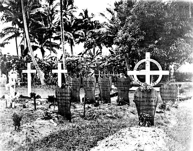 ‘Knowing them well, I easily recognized their features, especially the American officers. They were very little distorted. After washing them in a stream close by, we rolled them up in Samoan mats, placed them in a basket, and set out for Apia…’ The coffins were opened and heads and ears added.
